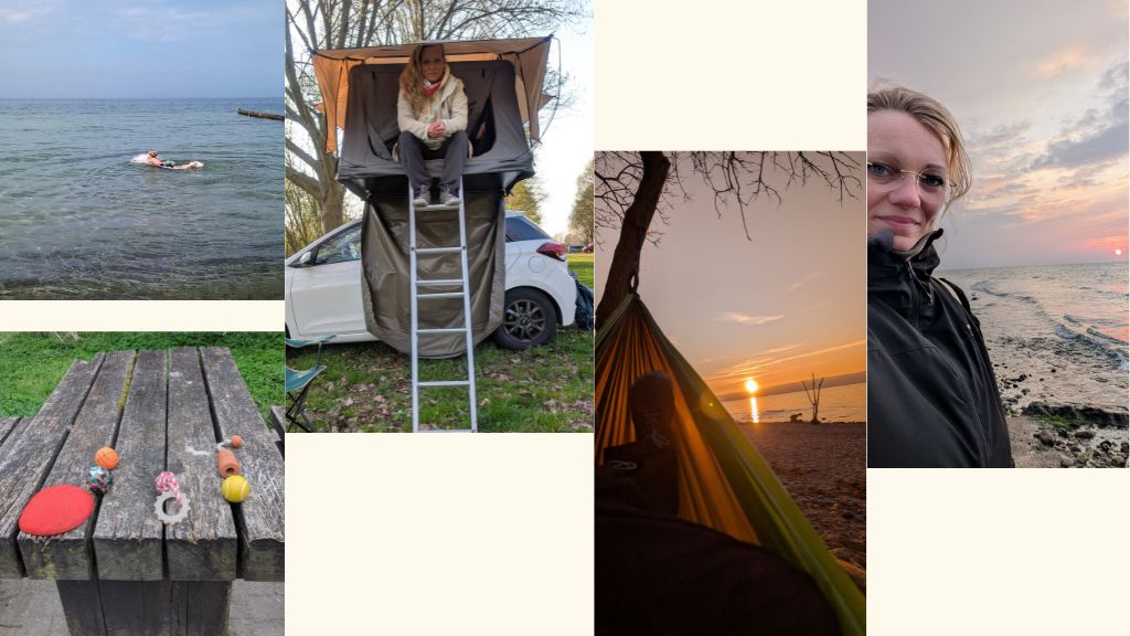 Eine Woche nach Faros Tod hatte mein Kind Geburtstag, wurde 10. Die Osterferien hat er bei seinem Vater verbracht, und ich habe mein Dachzelt aufs Auto geschnallt und bin an die Ostsee gefahren. Ich habe die Bälle und Spielzeuge von Faro mitgenommen und auf einer Bank an “unserem” Strandeingang verteilt, als letzten Gruß. Er hat die Ostsee geliebt, und so war ich – ich glaube vier oder fünf Nächte – an der Ostsee in einem Ort, wo ich schon selbst seit 30 Jahren hinfahre, wo er auch so oft war. Ich nächtigte auf einem Parkplatz, roch und hörte das Meer, habe in den Wald gekackt, war in der Ostsee baden (mehrmals, war frisch :D) und habe für mich festgestellt: Das macht mir keine Angst, ich kann das alles sehr gut.