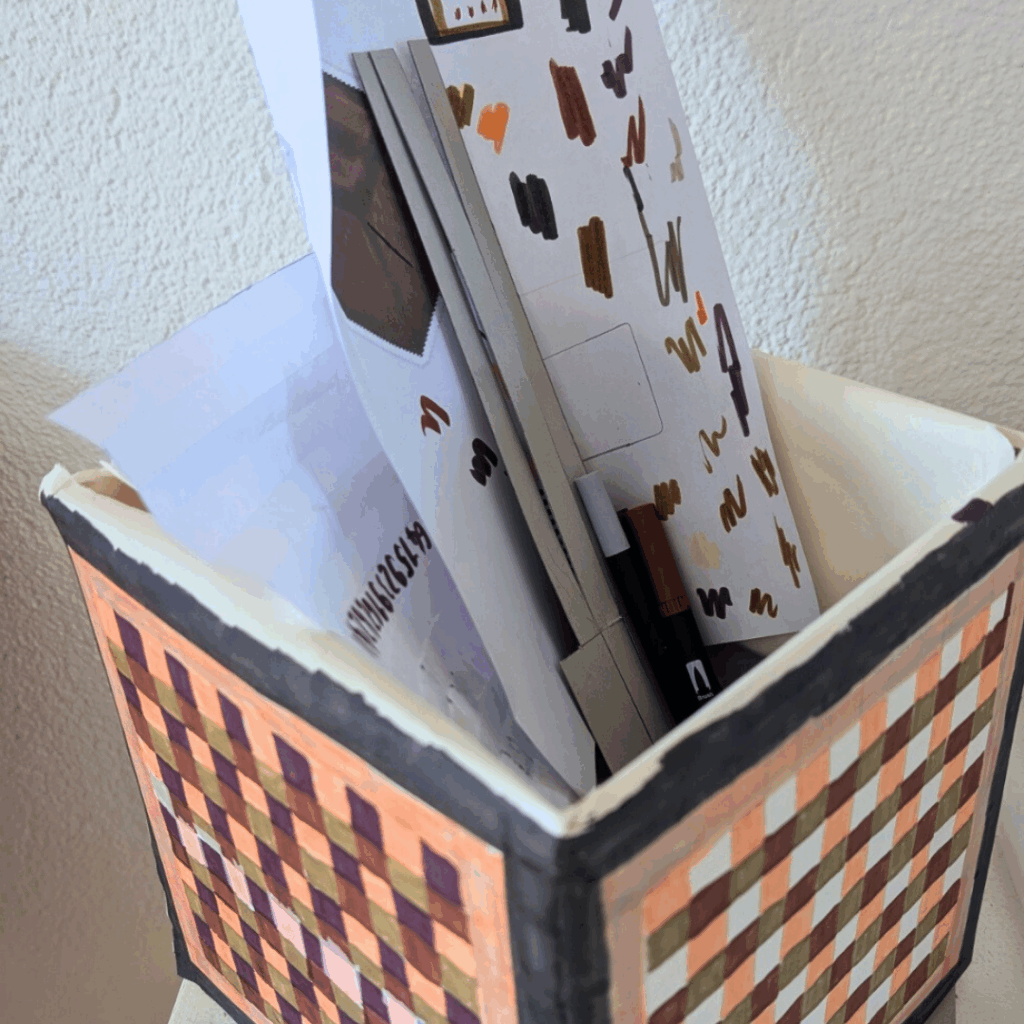 Gemeinsam suchten wir passende Filzstiftfarben aus. Ich maß Kiste aus (natürlich nicht 16 cm pro Seite sondern 19 cm, das wäre ja zu einfach gewesen) und bastelte eine Schablone aus Pappe – vier ca 1,2 cm breite Streifen, mit denen wir gleichmäßige Linien ziehen konnten. Wir umwickelten die Kiste mit großem Papier (danke an die Papierrrollen von IKEA) und begannen, die erste Seite anzuzeichnen. Bissl schräg, aber er war zufrieden.